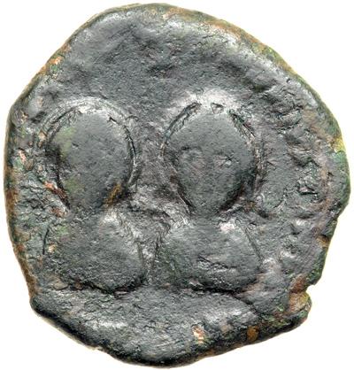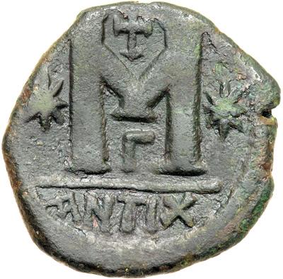 Byzantine Empire. Justin I and Justinian I, Apr.-Aug. 527. follis or 40 nummi (14.68g), Antioch, 3rd officina. Facing diad., dr. and cuir. busts of Justin, on l., and Justinian, on r., both nimbate, cross above. Rev. Large M between two stars, ANTIX in ex. DOC 14 var. (this officina not recorded); MIB 10; Sear 130 var. Fine/very fine and very rare, only two specimens recorded by Hahn.