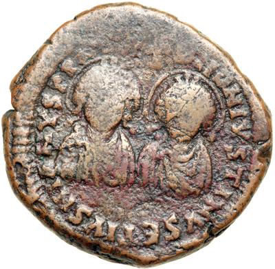 Byzantine Empire. Justin I and Justinian I, Apr.-Aug. 527. follis or 40 nummi (14.87g), Antioch, 4th officina. Facing diad., dr. and cuir. busts of Justin, on l., and Justinian, on r., both nimbate, cross above. Rev. Large M between two stars, ANTIX in ex. DOC 14 (citing Sabatier 3); MIB 10; Sear 130. Very Fine for the type and very rare, only four specimens recorded by Hahn, an unusually good example of this remarkable follis type.