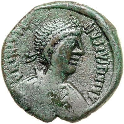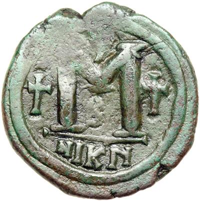 Byzantine Empire. Justin I and Justinian I, Apr.-Aug. 527. follis or 40 nummi (15.34g), Nicomedia, 2nd officina. Diad. bust of Justin r. Rev. Large M between two crosses, NIKM in ex. Cf. DOC 13 (citing Sabatier 5); MIB 8; Sear 128. Good very fine and very rare, choice green patina, only eight specimens recorded by Hahn.