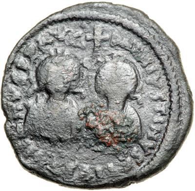 Byzantine Empire. Justin I and Justinian I, Apr.-Aug. 527. follis or 40 nummi (15.98g), Antioch, 2nd officina. Facing diad., dr. and cuir. busts of Justin, on l., and Justinian, on r., both nimbate, cross above. Rev. Large M between two stars, ANTIX in ex. DOC 14 var. (this officina not recorded); MIB 10; Sear 130 var. Fine or better and very rare, struck on a full flan, surface deposit on Justinian's bust, only three specimens recorded by Hahn.