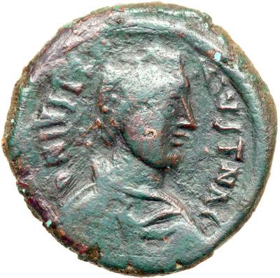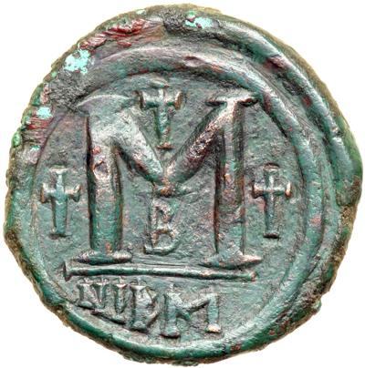 Byzantine Empire. Justin I and Justinian I, Apr.-Aug. 527. follis or 40 nummi (16.35g), Nicomedia, 2nd officina. Diad. bust of Justin r. Rev. Large M between two crosses, NIKM in ex. Cf. DOC 13 (citing Sabatier 5); MIB 8; Sear 128. Very Fine and very rare, some active verdigris on reverse, only eight specimens recorded by Hahn.