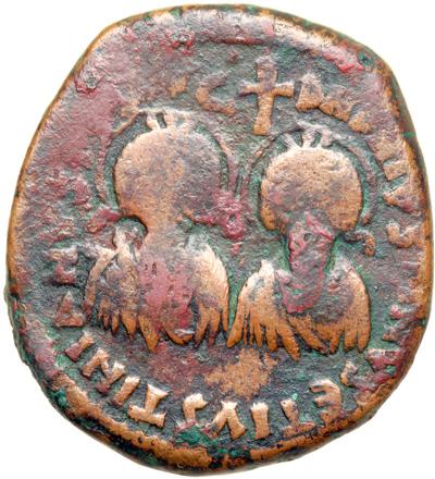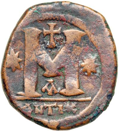 Byzantine Empire. Justin I and Justinian I, Apr.-Aug. 527. follis or 40 nummi (17.47g), Antioch, 1st officina. Facing diad., dr. and cuir. busts of Justin, on l., and Justinian, on r., both nimbate, cross above. Rev. Large M between two stars, ANTIX in ex. DOC 14 var. (this officina not recorded); MIB 10; Sear 130 var. Fine with light brown patina and very rare, only three specimens recorded by Hahn.