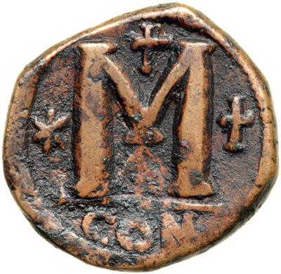 Byzantine Empire. Justin I and Justinian I, Apr.-Aug. 527. follis or 40 nummi (17.54g), Constantinople, 1st officina. Diad. bust of Justin r. Rev. Large M between star and cross. DOC 11 var. (citing Ratto 439, this officina not recorded); MIB 4; Sear 126 var. Nearly Very Fine and rare, the head and officina mark flatly struck.