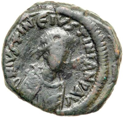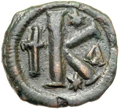 Byzantine Empire. Justin I and Justinian I, Apr.-Aug. 527. half follis or 20 nummi (9.53g), Constantinople, 1st officina. Diad. bust of Justin r. Rev. Large K with cross to l., stars in upper and lower field. DOC -; MIB 5; Sear 126A. Very Fine or better with dark green patina and extremely rare, one of only three specimens recorded by Hahn.