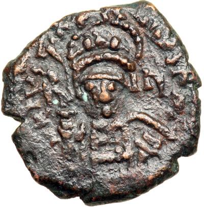 Byzantine Empire. Justin II, 565-578. decanummium or 10 nummi (3.79g), Antioch, 565/6 (regnal year 1). Helmeted bust facing, holding Victory on globe and shield. Rev. Large I between ANNO and I, TH[UP] below. DOC 147a; MIB 61; Sear 382. Very Fine and very rare, brown patina.