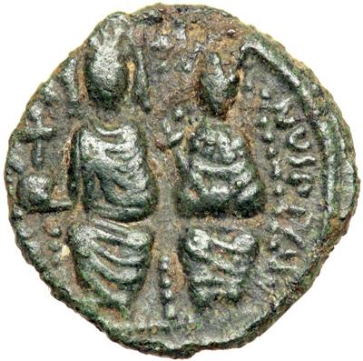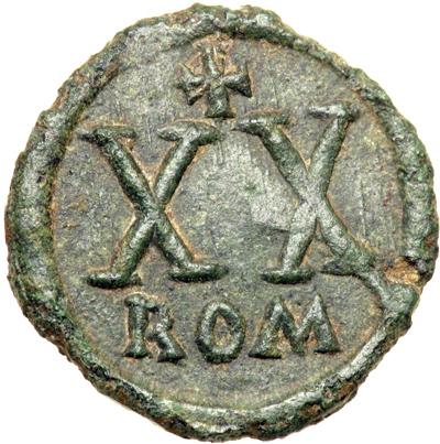 Byzantine Empire. Justin II and Sophia, 565-578. half follis or 20 nummi (3.74g), Rome or military mint. Justin, holding gl. cr., and Sophia, holding cruciform scepter, enthroned facing, side by side, cross between their hds. Rev. Large XX, cross above, ROM below. DOC 206; MIB 95b; Sear 404. Extremely Fine and rare with olive-green patina.