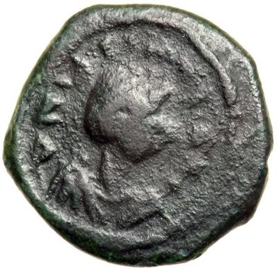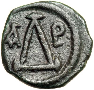 Byzantine Empire. Justinian I, 527-565. 4 nummi (1.32g), Thessalonica, 527-38. Diad. bust r. Rev. Large delta between A and P. DOC 101 var.; MIB 175; Sear 194. Very Fine but obverse die worn, very rare.