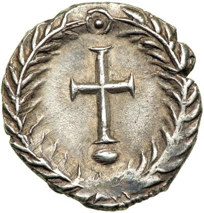 Byzantine Empire. Justinian I, 527-565. AR Light Half Siliqua (1.08g), Triton VIII (2005), lot 1322. Diad. bust r. Rev. Cross on globus, all within wreath. DOC 337; MIB 80; Sear 318. Nearly Extremely Fine, lightly toned and very scarce, obverse a little off-center.