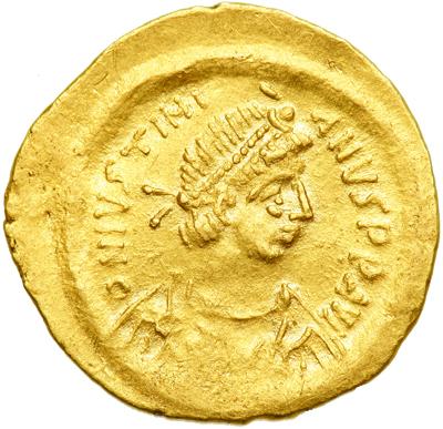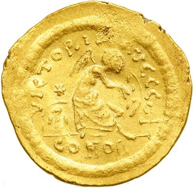 Byzantine Empire. Justinian I, 527-565. Gold Semissis (2.23g), Constantinople. Diad. bust r. Rev. VICTORIA AVGGG, Victory seated r., inscribing shield set on knee, star to l., reversed Christogram to r., CONOB in ex. DOC 18; MIB 18; Sear 144. Good very fine, weakly struck, as usual for this denomination.