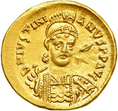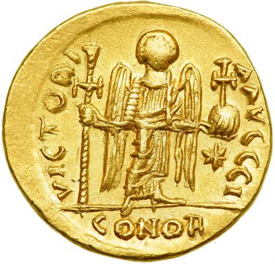 Byzantine Empire. Justinian I, 527-565. Gold Solidus (4.48g), Constantinople, 10th officina. Helmeted and cuir. bust three-quarter face to r., holding spear and shield. Rev. VICTORIA AVGGG I, angel facing, holding long cross and gl. cr., star to r., CONOB in ex. DOC 3i; MIB 5; Sear 137. Good very fine, an attractive example of this scarce early type.