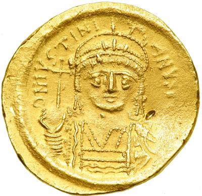 Byzantine Empire. Justinian I, 527-565. Gold light weight Solidus of 20 siliquae (3.73g), Constantinople, 10th officina. Obv. As previous. Rev. VICTORIA AVGGG I, angel facing, holding long cross and globe, star to r., OBXX in ex. DOC 10; MIB 15; Sear 142. Very Fine and very rare, several small surface cuts on obverse and reverse.