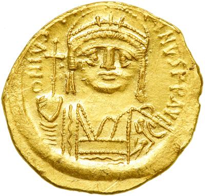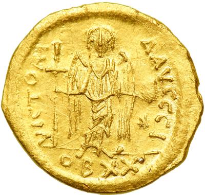 Byzantine Empire. Justinian I, 527-565. Gold light weight Solidus of 20 suliquae (3.29g), Constantinople, 10th officina. Another, all as previous. DOC 10; MIB 15; Sear 142. About Extremely Fine and very rare, but with edge clipping.
