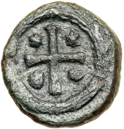 Byzantine Empire. Justinian I, 527-565. decanummium or 10 nummi (2.98g), Ravenna, 552-65. Helmeted bust facing, holding gl. cr. and shield. Rev. Large cross with star in each angle, all within wreath. DOC (Uncertain Mints) 366; MIB 238; Sear 334. Very Fine or better and rare, green-brown patina.