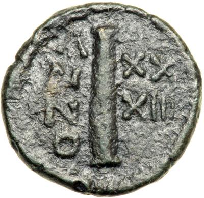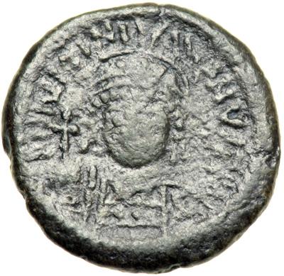 Byzantine Empire. Justinian I, 527-565. decanummium or 10 nummi (3.74g), Rome or Ravenna, 559/60 (regnal year 33). Helmeted bust facing, holding gl. cr. and shield. Rev. Large I between ANNO and XXXIII. Cf. DOC 347-55 (this date not recorded); MIB 229a var. (this date not recorded); Sear 326 var. Very Fine or better with dark patina, rare.