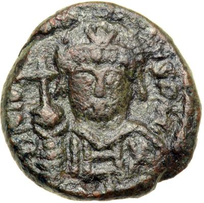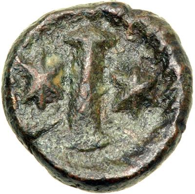 Byzantine Empire. Justinian I, 527-565. decanummium or 10 nummi (5.65g), Rome, 547-52. Helmeted bust facing, holding gl. cr. and shield. Rev. Large I between two stars, all within wreath. DOC 331; MIB 228; Sear 308. Very Fine with green-brown patina.
