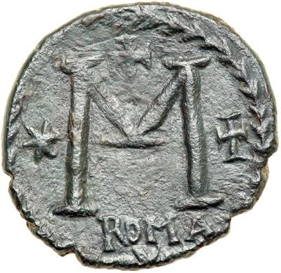 Byzantine Empire. Justinian I, 527-565. follis or 40 nummi (10.36g), Rome, 537-541. Another specimen, all as previous lot. DOC 322; MIB 214; Sear 294. Very Fine or better with brown patina.