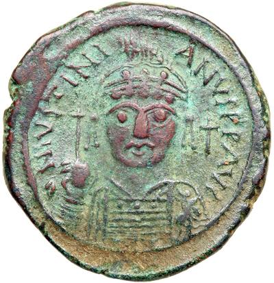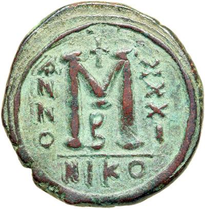 Byzantine Empire. Justinian I, 527-565. follis or 40 nummi (17.83g), Nicomedia, 2nd officina, 557/8 (regnal year 31). Helmeted bust facing, holding gl. cr. and shield. Rev. Large M between ANNO and XXXI, NIKO in ex. DOC 137b; MIB 113a; Sear 201. Very Fine with green-brown patina.