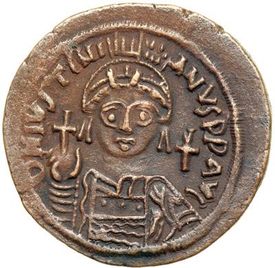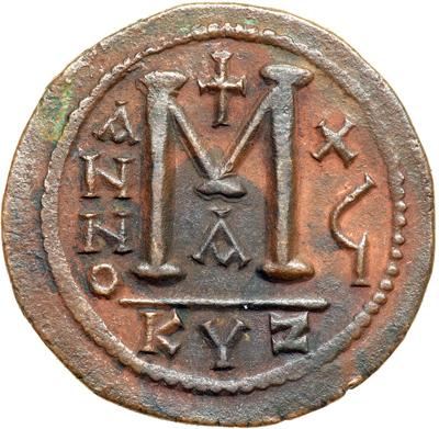 Byzantine Empire. Justinian I, 527-565. follis or 40 nummi (19.7g), Cyzicus, 1st officina, 542/3 (regnal year 16). Helmeted bust facing, holding gl. cr. and shield. Rev. Large M between ANNO and XUI, KYZ in ex. DOC 168a; MIB 120a; Sear 207. Good Very Fine or better.