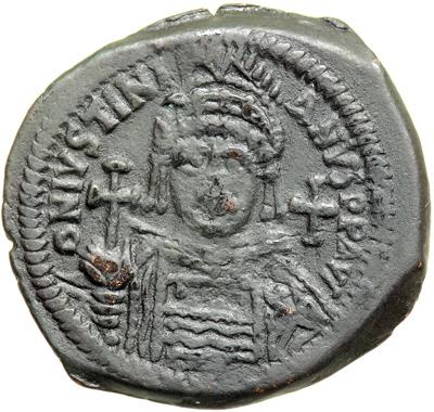 Byzantine Empire. Justinian I, 527-565. follis or 40 nummi (20.14g), Antioch, 4th officina, 555/6 (regnal year 29). Helmeted bust facing, holding gl. cr. and shield. Rev. Large M between ANNO and XXUIIII, THU? in ex. DOC -; MIB 147a var. (this officina not recorded); Sear -. Very Fine or better and rare, with dark brown patina.