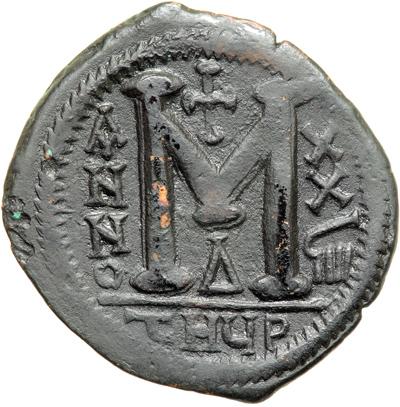 Byzantine Empire. Justinian I, 527-565. follis or 40 nummi (20.14g), Antioch, 4th officina, 555/6 (r