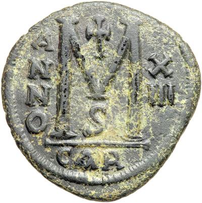 Byzantine Empire. Justinian I, 527-565. follis or 40 nummi (21.17g), Carthage, 539/40 (regnal year 13). Another specimen, all as previous lot. DOC 292a; MIB 195; Sear 261. Nearly Very Fine/very fine with green patina, several scrape marks on obverse.