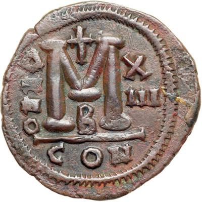 Byzantine Empire. Justinian I, 527-565. follis or 40 nummi (22.13g), Constantinople, 2nd officina, 539/40 (regnal year. 13). Helmeted bust facing, holding gl. cr. and shield. Rev. Large M between ANNO and XIII. DOC 38b; MIB 95a; Sear 163. Nearly Extremely Fine with nice smooth brown patina.