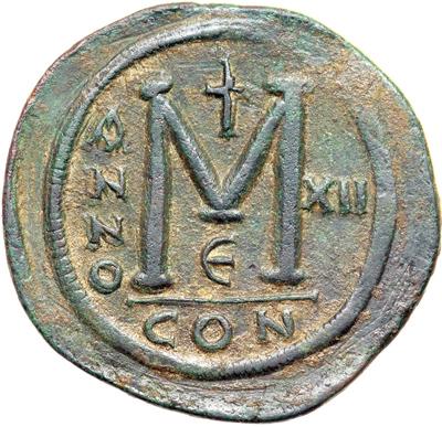 Byzantine Empire. Justinian I, 527-565. follis or 40 nummi (22.1g), Constantinople, 5th officina, 538/9 (regnal year 12). Helmeted bust facing, holding gl. cr. and shield. Rev. Large M between ANNO and XII. DOC 37e; MIB 95a; Sear 163. Good very fine with attractive light green patina, a handsome example of the initial issue of Justinian's dated folles.