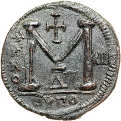 Byzantine Empire. Justinian I, 527-565. follis or 40 nummi (22.24g), Antioch, 4th officina, 539/40 (regnal year 13). Helmeted bust facing, holding gl. cr. and shield. Rev. Large M between ANNO and XIII, QUPO in ex. DOC 215 var. (this officina not recorded); MIB 143; Sear 218. Choice Extremely Fine with lovely brown patina.
