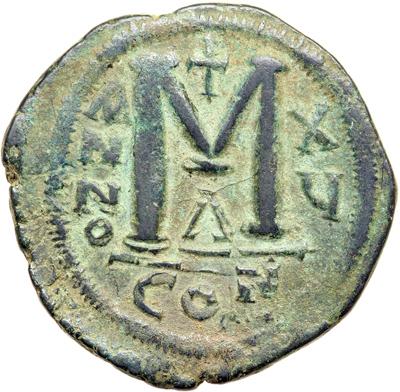 Byzantine Empire. Justinian I, 527-565. follis or 40 nummi (22.3g), Constantinople, 4th officina, 541/2 (regnal year 15). Helmeted bust facing, holding gl. cr. and shield. Rev. Large M between ANNO and XU. DOC 40d; MIB 95a; Sear 163. Good very fine with green-brown patina, some double-striking on reverse.