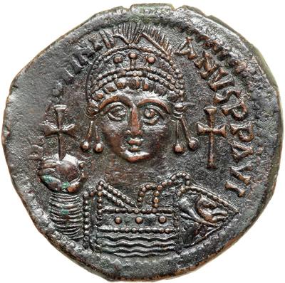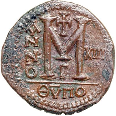 Byzantine Empire. Justinian I, 527-565. follis or 40 nummi (22g), Antioch, 3rd officina, 539/40 (regnal year 13). Helmeted bust facing, holding gl. cr. and shield. Rev. Large M between ANNO and XIII, QUPO in ex. DOC 215c; MIB 143; Sear 218. Extremely Fine, a handsome example with nice patina.