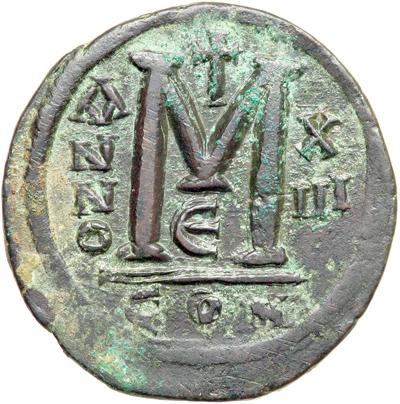 Byzantine Empire. Justinian I, 527-565. follis or 40 nummi (23.61g), Constantinople, 5th officina, 539/40 (regnal year. 13). Helmeted bust facing, holding gl. cr. and shield. Rev. Large M between ANNO and XIII. DOC 38e; MIB 95a; Sear 163. Nearly Extremely Fine with green-brown patina.