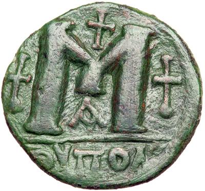 Byzantine Empire. Justinian I, 527-565. follis or 40 nummi (8.3g). , irregular mint in imitation of the Antiochene coinage of c. 536/7, but in the name of Anastasius I (491-518). D N ANASTASIVS PP AVG, diad. bust r. Rev. Large M between two globus crosses, another cross above, officina mark A below, QYPOLS in ex. A curious and unpublished hybrid type. Very Fine with attractive light green patina, interesting.