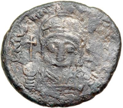 Byzantine Empire. Justinian I, 527-565. follis or 40 nummi (9.81g), Ravenna, 563/4 (regnal year 37). Helmeted bust facing, holding gl. cr. and shield (?). Rev. Large M between ANNO and XXXVII, RAVEN/NA in ex. DOC 342; MIB 233; Sear 323. Fine and rare, with brown patina, overstruck on a 400-year-old as of Antoninus Pius whose head is faintly visible on reverse.