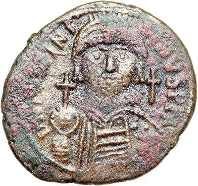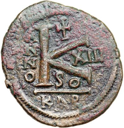 Byzantine Empire. Justinian I, 527-565. half follis or 20 nummi (11.54g), Carthage, 539/40 (regnal year 13). Helmeted bust facing, holding gl. cr. and shield. Rev. Large K between ANNO and XIII, SO below, KAR in ex. DOC 294; MIB 196; Sear 264. Very Fine with brown patina.