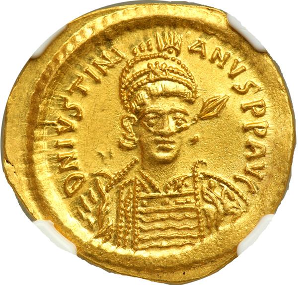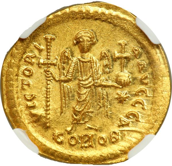 Byzantine Empire. Justinian I, 527-565. Gold Solidus (4.41 g) minted at Constantinople. Bust three-quarter facing right, spear behind head. Reverse: Angel standing facing. D.O. 3a; S. 137. Perfectly struck on a huge flan with full legends. An absolute gem specimen. NGC graded Choice Mint State: Strike 5/5; Surface 5/5.