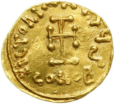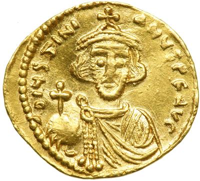 Byzantine Empire. Justinian II, First Reign, 685-695. Gold Tremissis (1.3g), Constantinople. 687-92. Obv. Crowned bust of emperor facing, wearing chlamys and holding gl.cr. Rev. VICTORIA AVGUS, cross potent CONOB beneath. DOC 13; MIB 15; Sear 1255. Good very fine and attractive, very scarce.