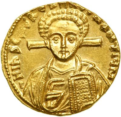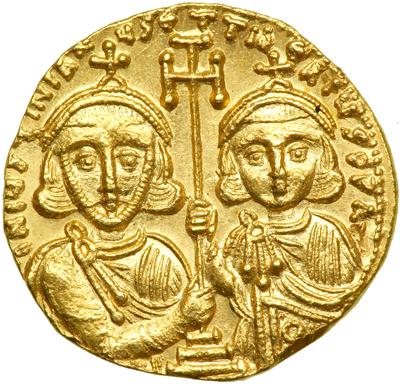 Byzantine Empire. Justinian II and Tiberius, 705-711. Gold Solidus (4.4g), Constantinople. Another, all as previous, but the figure of Tiberius is much larger, almost the same size as his father. DOC 2b; MIB 2b; Sear 1415. Brilliant, good Extremely Fine.