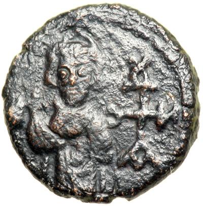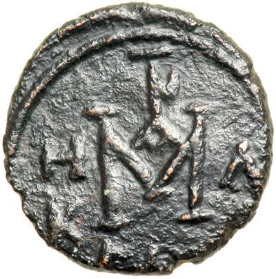 Byzantine Empire. Justinian II, first reign, 685-695. follis or 40 nummi (3.23g), Carthage, 694/5 (8th indiction). Justinian stg. facing, holding gl. cr. and akakia, between two monograms. Rev. Large M between H / K and lambda, monogram above, mint mark below. Cf. DOC 33 (citing Tolstoi 81); MIB 56; Sear 1270. Very Fine and very rare with dark brown patina.