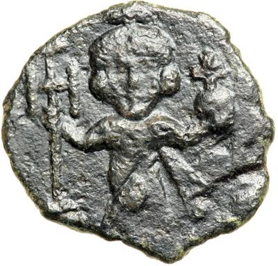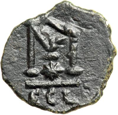 Byzantine Empire. Justinian II, first reign, 685-695. follis or 40 nummi (3.32g), Syracuse, c. 691-2. Justinian stg. facing, holding cross potent on two steps and gl. cr. Rev. Large M, monogram above, star beneath, SCL in ex. DOC 60; MIB 67; Spahr 221; Sear 1300. Good very fine with dark patina.
