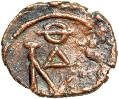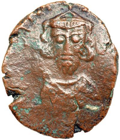 Byzantine Empire. Justinian II, first reign, 685-695. follis or 40 nummi (4.33g), Carthage, c. 690-91. Crowned bust facing, holding g. cr. Rev. Large M, theta over delta above. DOC 32; MIB 55; Sear 1269. Good Very Fine and very rare, obverse a little weakly struck.