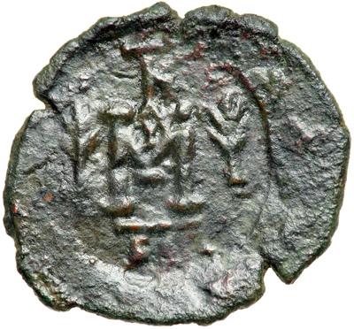 Byzantine Empire. Justinian II, first reign, 685-695. follis or 40 nummi (4.7g), Syracuse, c. 695. Justinian enthroned facing, holding gl. cr. and akakia, star to r. Rev. Large M between two palms, monogram above, SCL in ex. DOC 64; MIB 73; Spahr 222; Sear 1304. Nearly Very Fine and rare with dark brown patina, overstruck as usual.