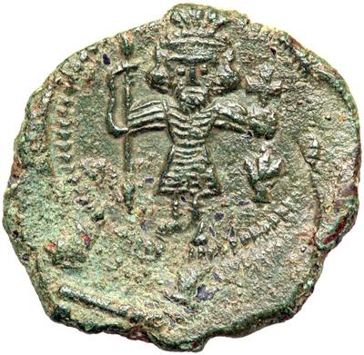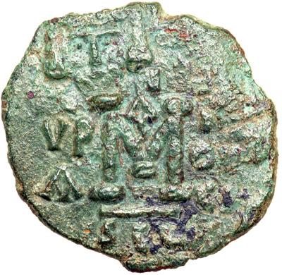 Byzantine Empire. Justinian II, first reign, 685-695. follis or 40 nummi (5.82g), Syracuse, c. 693-4. Justinian, in military attire, stg. facing, holding spear and gl. cr., plant in r. field. Rev. Large M between mint name CVPA-KOVCI in two columns, monogram above, SCL in ex. DOC 61; MIB 71; Spahr 225; Sear 1301. Rare and Extremely Fine for the type with attractive green patina, overstruck on another follis type of this reign.