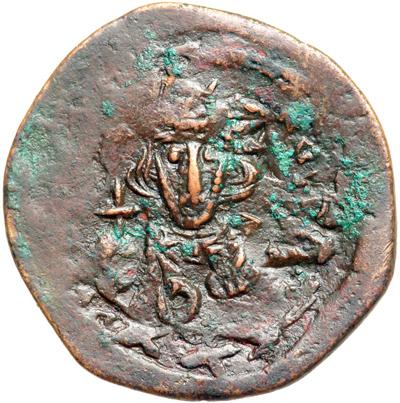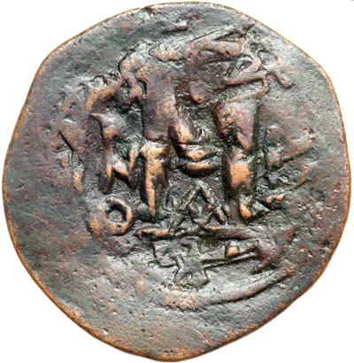 Byzantine Empire. Justinian II, first reign, 685-695. follis or 40 nummi (9.54g), Constantinople, 1st officina, 685/6 (regnal year 1). Crowned bust facing, holding gl. cr. Rev. Large M between ANNO and I. Berk 752.A; cf. DOC 18, MIB 44, and Sear 1260, but no examples of year 1 noted. Very Fine and extremely rare, possibly only the second specimen known, overstruck.
