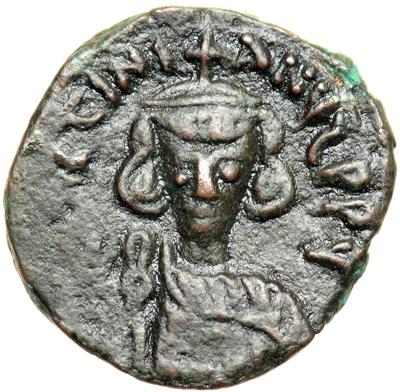 Byzantine Empire. Justinian II, first reign, 685-695. half follis or 20 nummi (4.09g), Sardinia, c. 692-5. Crowned bust facing, wearing chlamys and holding gl. cr. Rev. Large K with crosses on either side and above, PAX beneath. DOC 39; MIB 63; Sear 1279. Good Very Fine with dark patina, exceptionally fine example of this rare issue.