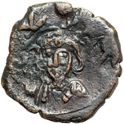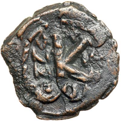 Byzantine Empire. Justinian II, first reign, 685-695. half follis or 20 nummi (4.51g), Constantinople, officina and date. uncertain. Crowned bust facing, wearing chlamys and holding gl. cr. Rev. Large K between ANNO and [regnal year numeral]. Cf. DOC 20-25; MIB 47; Sear 1262. Very Fine and rare, the types obscured by overstriking.