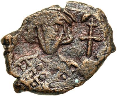 Byzantine Empire. Justinian II, second reign, 705-711. half follis or 20 nummi (4.43g), Constantinople, 1st officina. 705 (regnal year 20). Crowned bust facing, wearing loros and holding cross potent and gl. cr. Rev. Large K between ANNO and XX, A beneath. DOC 13a var.; MIB 44a; Sear 1429. Fine and rare.