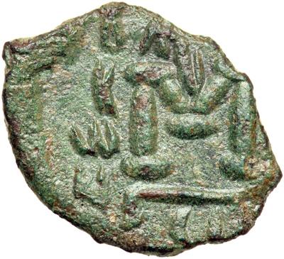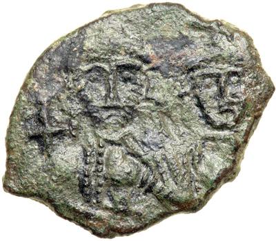 Byzantine Empire. Leo III and Constantine V, 720-741. follis or 40 nummi (3.78g), Syracuse. Facing crowned busts of Leo III (on l.) and Constantine V, each holding gl. cr. and akakia. Rev. Large M between B KwN and [CTA], monogram of Leo above, SCL in ex. DOC 53; Spahr 317; Sear 1529A. Good very fine with olive green patina, extremely rare - probably one of only half a dozen known.