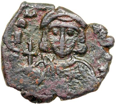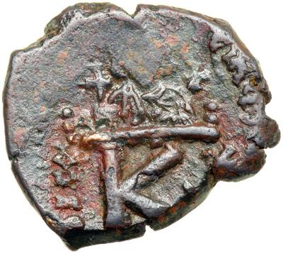 Byzantine Empire. Leo III and Constantine V, 720-741. half follis or 20 nummi (4.65g), Constantinople, c. 720-21. Crowned bust of Leo III facing, holding gl. cr. and akakia. Rev. Large K between ANNO and X[X], surmounted by similar crowned bust of Constantine V above horizontal line, DOC 32; Sear 1518. Very Fine and rare with brown patina.