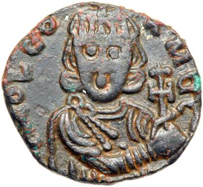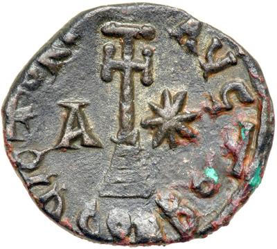 Byzantine Empire. Leo IV, 775-780. solidus struck in bronze (4.08g, possibly originally gilded), Rome(time of Pope. Hadrian I). Crowned bust facing, wearing chlamys and holding cross potent in r. hand which is stretched across his chest. Rev. Cross potent on three steps, A in l. field, star in r., CON B below. DOC (Leo III) 98; Ricotti Prina 149. Sear (Leo III) 1537A. Very Fine and extremely rare, slight traces of gilding to right of emperor's crown.