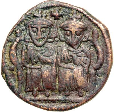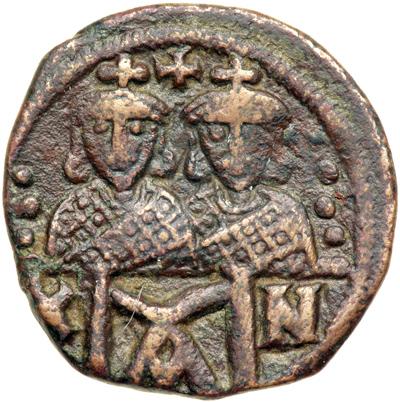 Byzantine Empire. Leo IV and Constantine VI, 776-780. follis or 40 nummi (5.57g), Constantinople, c. 778-80. Leo IV and Constantine VI seated facing on double throne, each crowned and wearing chlamys. Rev. Facing crowned busts of the deceased Leo III and Constantine V, each wearing loros, M / A between X and N beneath exergual line. DOC 6; Sear 1587. Very Fine or better, a most attractive example of a follis from the middle years of the iconoclast period.